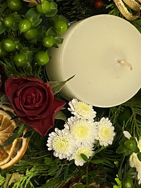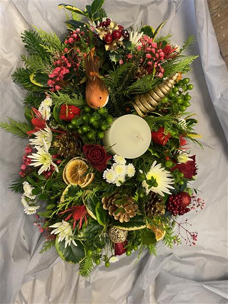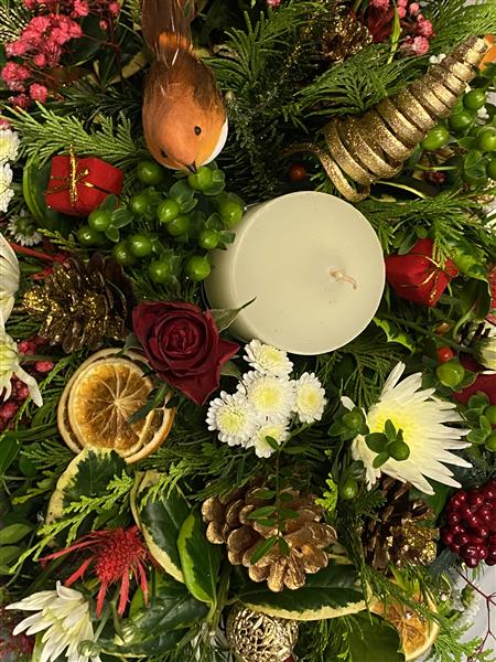 A festive arrangement filled with red seasonal flowers, festive foliages, aromatic decorations and a chunky church candle.