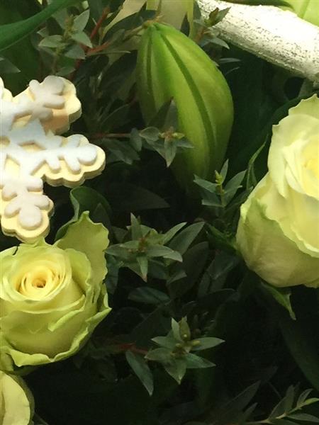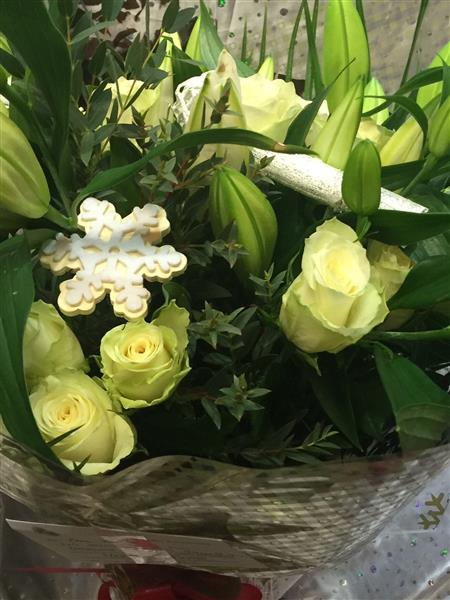 White roses, white lilies, eucalyptus and Christmas decorations are the ingredients of this unusual beautifully scented hand tied bouquet.
