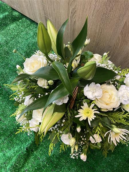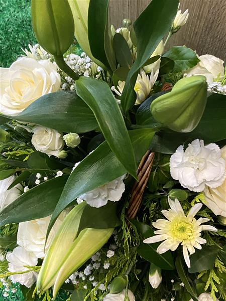A crisp collection of white blooms including roses, lilies, lisianthus and alstromeria arranged in a basket.