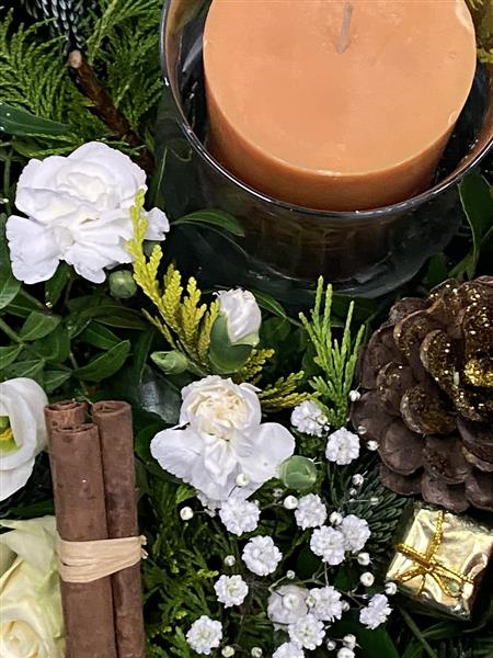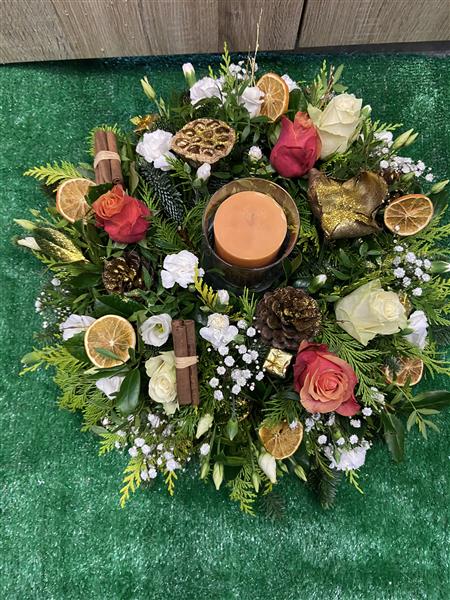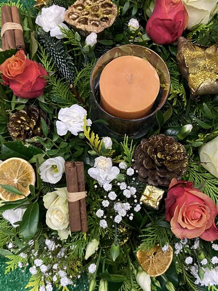 This elegant arrangement circling a candle in a vase, made with kotchia, noble pine, dried orange slices, wheat, lavender, cinnamon and cones makes a traditional centrepiece for your Christmas table.